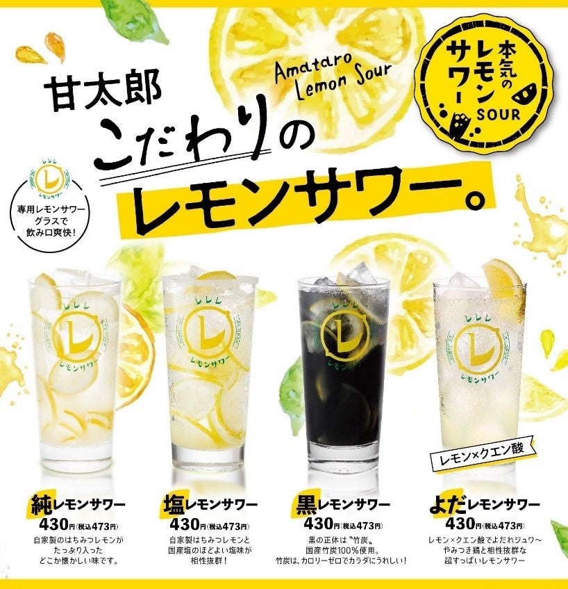 コロワイドグループの居酒屋「甘太郎」では、「本気のレモンサワー」として4種類のラインナップを販売しています。