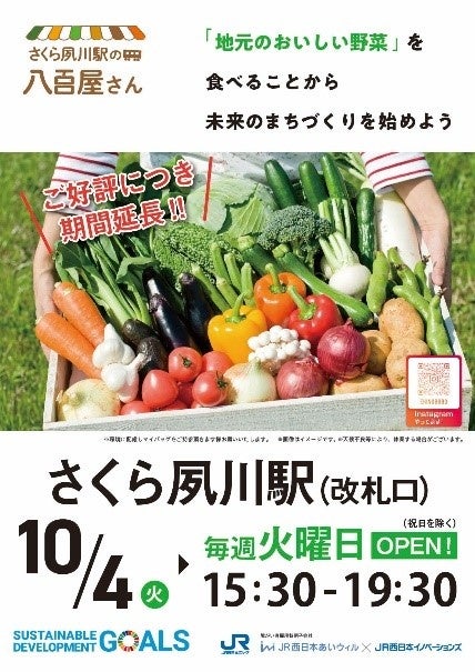 JR西日本グループの障がい者雇用を推進する特例子会社である株式会社JR西日本あいウィル(兵庫県尼崎市、取締役社長:三輪 正稔)と、JR西日本グループのオープンイノベーションを推進する株式会社JR西日本イノベーションズ(大阪市北区、代表取締役社長:奥野 誠)は、共同で「地産地消」「安心・おいしい」と「障がい者活躍」「農福連携」をキーワードに関西圏近郊の新鮮野菜を中心に取り揃える「○○駅の八百屋さん」を展開しておりますが、ご好評につき「さくら夙川駅の八百屋さん」の営業継続と、2022年5月の営業実施時にご好評をいただきました「甲子園口駅の八百屋さん」の営業を再開致します。