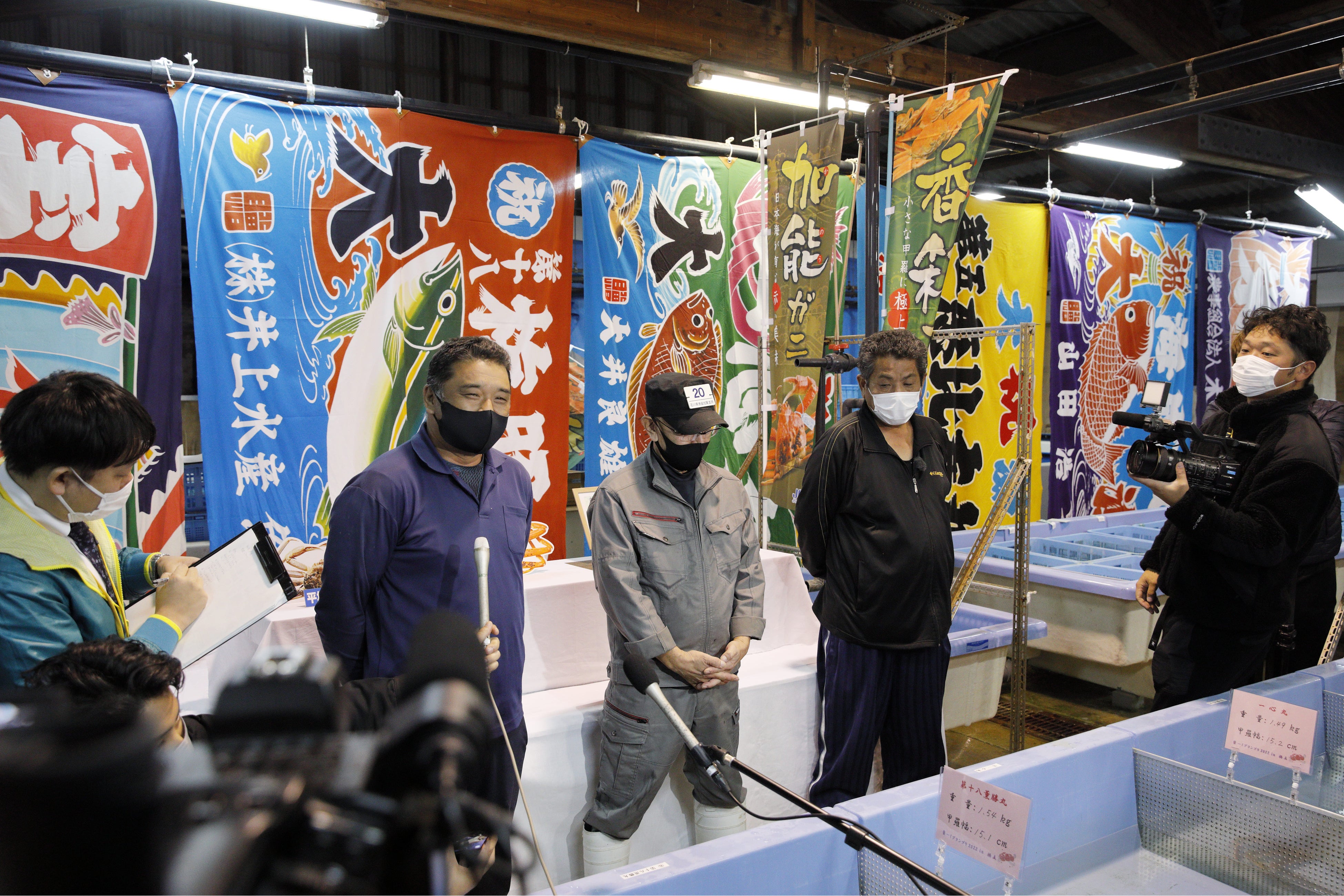 かなざわ総合市場では、石川県漁協 油谷市場長、加賀支所では橋本理事(いしかわ四季のさかなPR推進協議会会長)より、「輝姫」のブランド立ち上げの背景や特長などを発表後、加能ガニ(「蟹-1(カニワン)グランプリ」)、「輝姫」、「輝」の順でスタート。