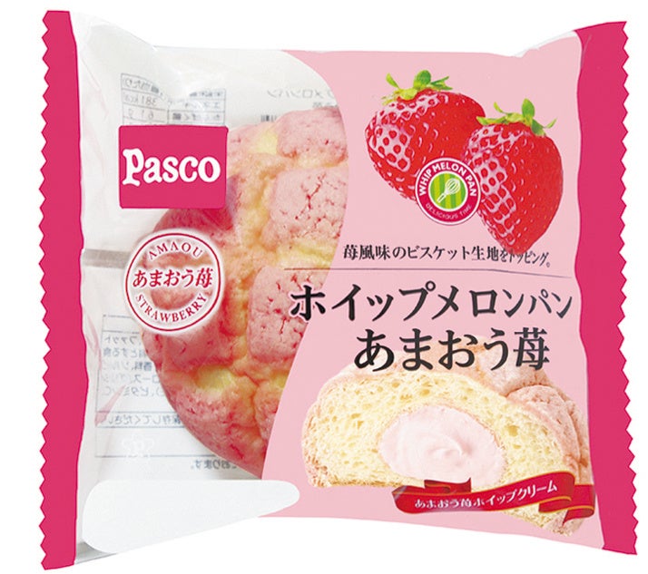 あまおう苺の加糖ピューレを練り込んだビスケット生地をトッピングしたメロンパンに、あまおう苺の濃縮果汁を使用したホイップクリームを注入しました。