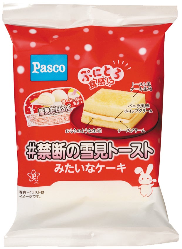 おもちのような生地、バニラ風味ホイップクリーム、チーズクリームをトースト風ケーキ生地ではさみました。あまじょっぱさがクセになる禁断のおいしさです。