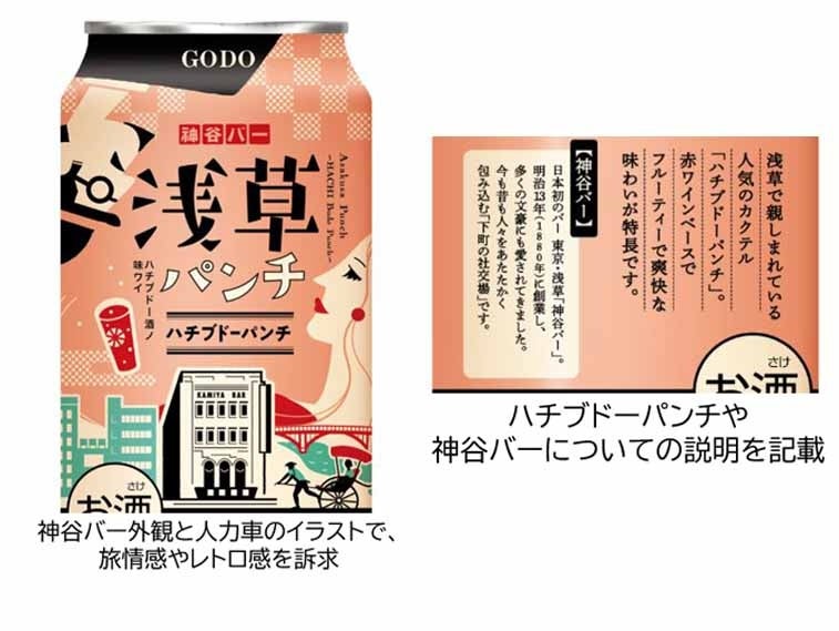 パッケージは、明治時代から浅草で親しまれている同店や人力車に乗った観光客、レトロモダンな画風の男女のイラストを描き、観光地として人気の浅草が醸し出すレトロ感を演出しています。また、裏面には、同店の歴史と、「ハチブドーパンチ」の味わいについて記載しています。