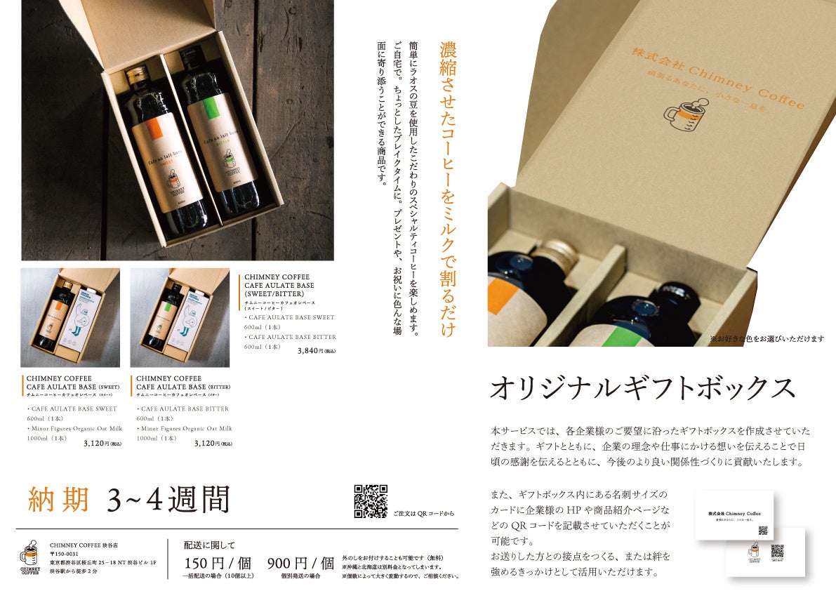 株式会社Chimney Coffee(本社:東京都渋谷区、代表取締役社長:山邊 諒太郎)は、企業ごとにオリジナルギフトボックスをデザインできる、法人専用ギフトサービスを開始いたしました。販売数1万本を超え大人気のオリジナルスペシャルティコーヒーをセットした、Chimney Coffeeでしか買えないギフトボックスセットです。