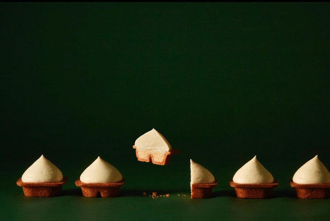 アーモンドプードルをリッチに使ったクッキー生地を熱い鉄板で挟み焼きすることで、ザクザクとしながらもしっとりコクがあり、バターの風味がより楽しめるリッチな仕上がりになっています。クッキー全体に油分で薄く膜を貼ることで、上に載せる生チーズスフレの水分移行を止め、ザクザク食感が長持ちするように工夫しています。