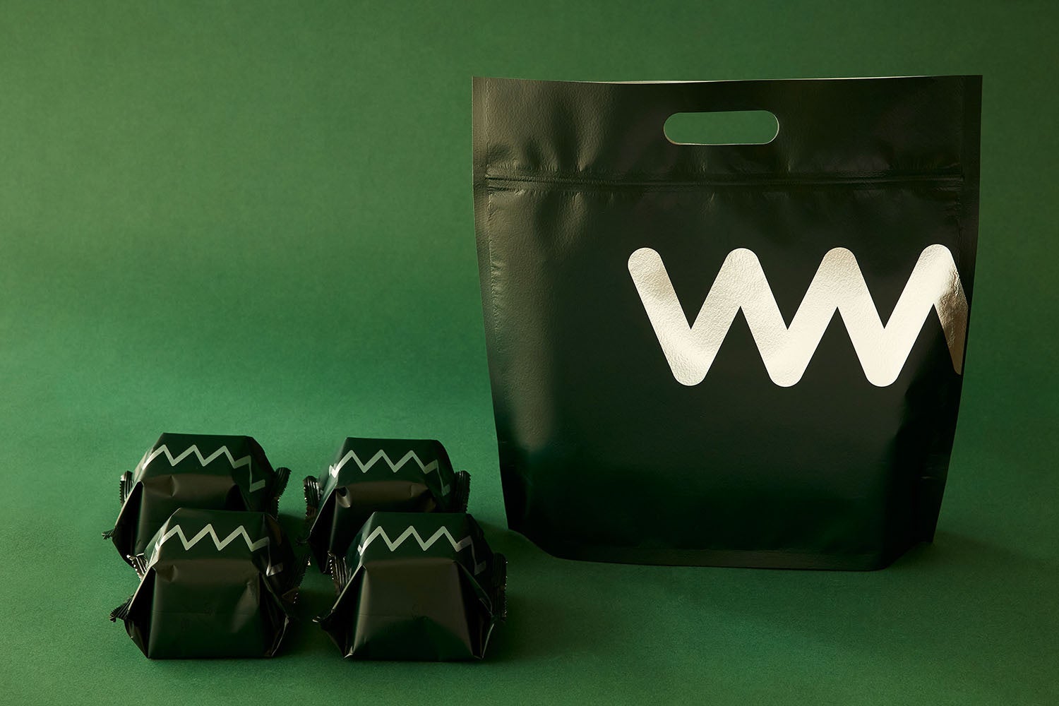 個包装で使用しているデザインに合わせ、牧草をモチーフとした深緑を主に、Wを連続させたブランドマークがシルバーにきらりと光り目を引くデザインに仕上げています。