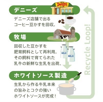しかし、コーヒー豆かすは、コーヒーの食数に比例して増え、削減できないという特性があります。そのためデニーズでは6年前からコーヒー豆かすの再資源化モデルについて研究を始め、2021年9月より神奈川県内の店舗で排出されたコーヒー豆かすを回収し、それを飼料化して活用する取り組みを始めました。この飼料は静岡県の牧場「リオグランデ宮島」で牛に給餌され、生産された生乳からできたホワイトソースを、デニーズのメニューに活用しています。こうして構築された食品循環スキームが、この度正式に国の「食品再生利用事業計画=食品リサイクルループ」として認定されました。