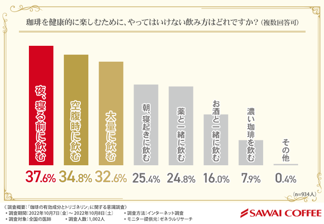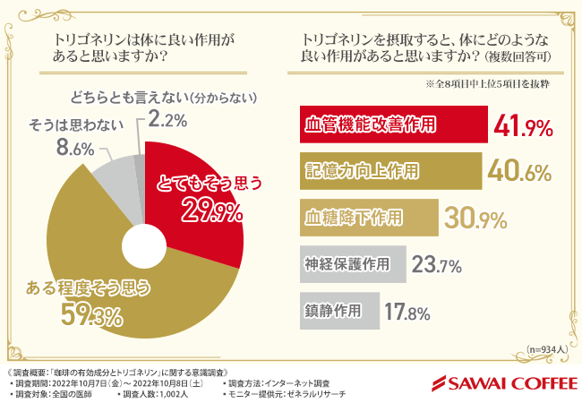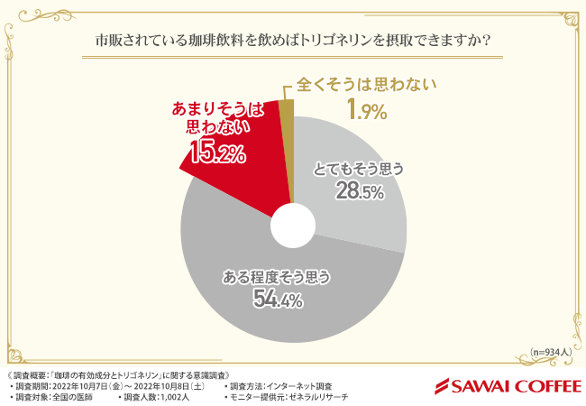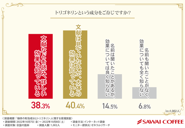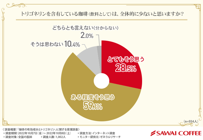 株式会社澤井珈琲(本社所在地:鳥取県境港市、代表取締役:澤井 幹雄)は、全国の医師を対象に、「珈琲の有効成分とトリゴネリン」に関する調査を実施しました。