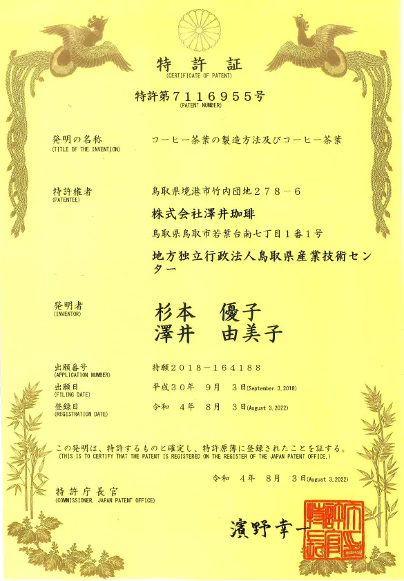 コーヒーには脳活性効果があるトリゴネリンという成分が含まれています。調べてみると、豆だけではなくコーヒーの葉や茎にもこの成分が豊富に含まれていることがわかり、コーヒー茶葉の開発に着手。茶葉とはいえコーヒーなのでカフェインを多く含み、カフェインの過剰摂取は身体に悪影響となるため、カフェイン含有量を低減しつつもトリゴネリンを多く含む製造方法を開発し、2022年8月には特許を取得しました。