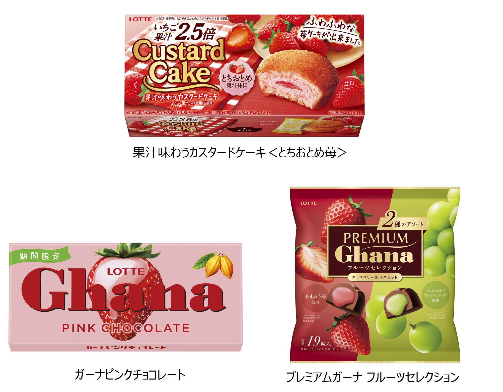 株式会社ロッテは11月15日(火)の「いい・苺の日」にちなんで、「カスタードケーキ」「ガーナ」の2つのブランドからいちご商品を発売いたします。「果汁味わうカスタードケーキ<とちおとめ苺>」は、ブランド初のいちご果汁入りのケーキ生地を採用し、例年よりもさらに苺の果汁感を味わえる品質になりました。ガーナブランドからは、3年連続好評の「ガーナピンクチョコレート」、プレミアムガーナ フルーツショコラ<ストロベリー><マスカット>2種の上質なひと粒ショコラをアソートした「プレミアムガーナ フルーツセレクション」が登場します。