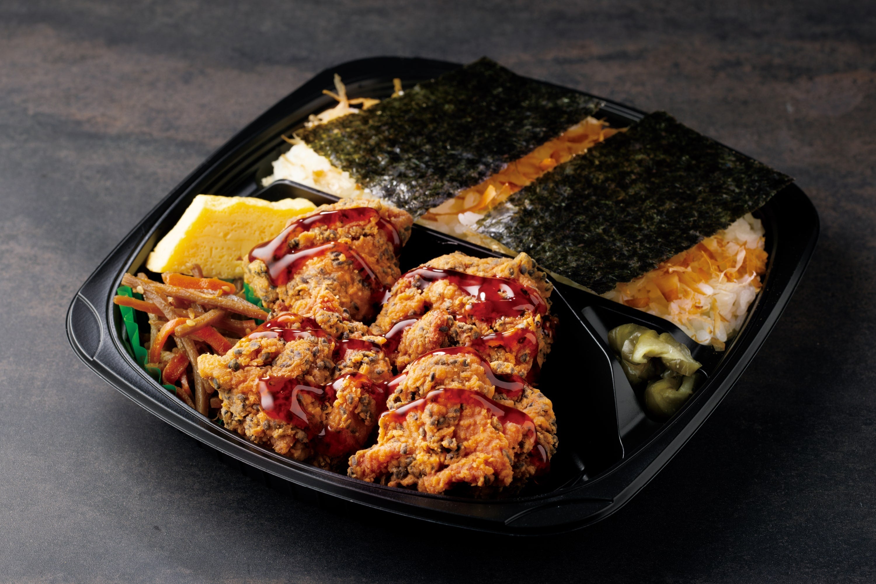 のりおかか醤油ご飯のお弁当「ブラック竜田のり弁当」と、ご飯のおかず「ブラック竜田(100gあたり本体価格198円)」をご用意しております。