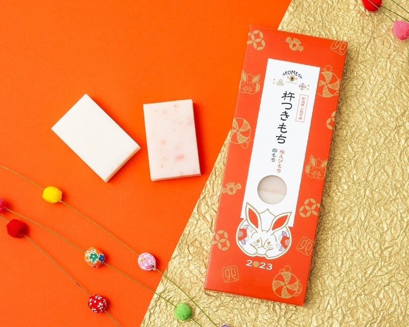 新潟県上越市産杵つきもちの白もちと桜えびもちをセットにした、華やかなパッケージの紅白もち。えびは曲がった腰と長いひげが長寿を表す縁起物。お年賀のご挨拶にもおすすめです。