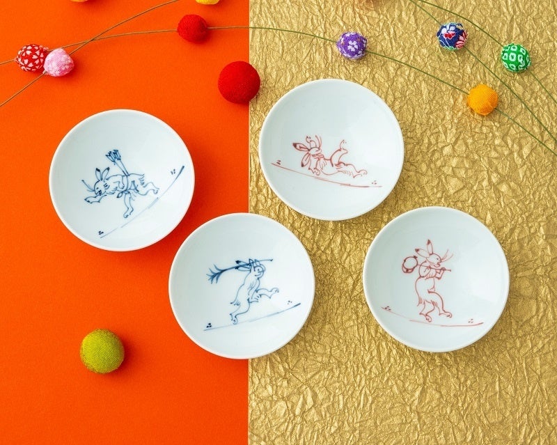 京都高山寺に残る鳥獣戯画図。日本最古の漫画ともいわれ、様々な動物がまるで人間のように動き回るさまがユーモラスに描かれています。その中から2023年の十二支「卯」を、高台付きの豆皿盃にひとつひとつ手書きで絵付けしました。