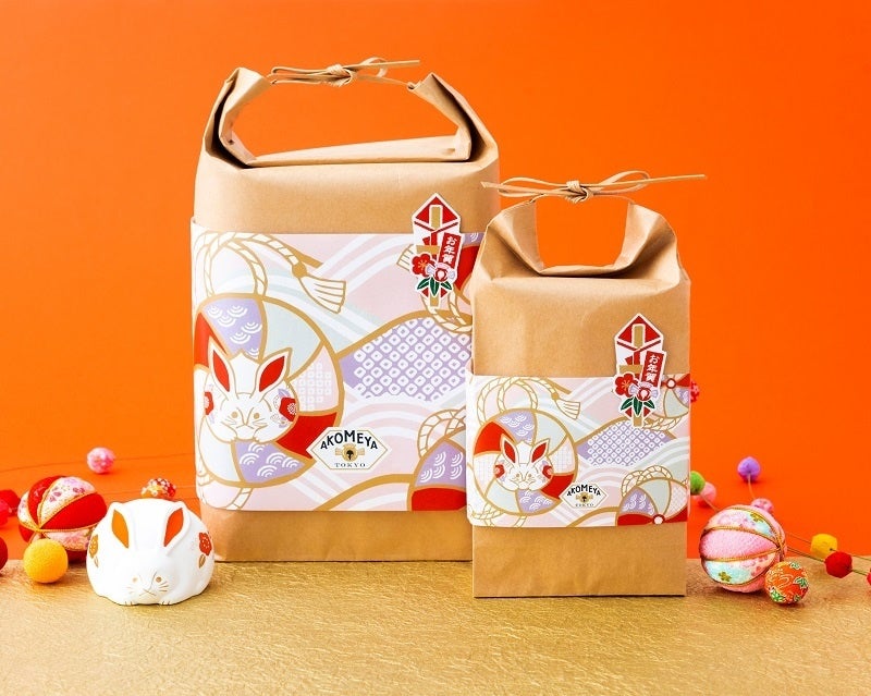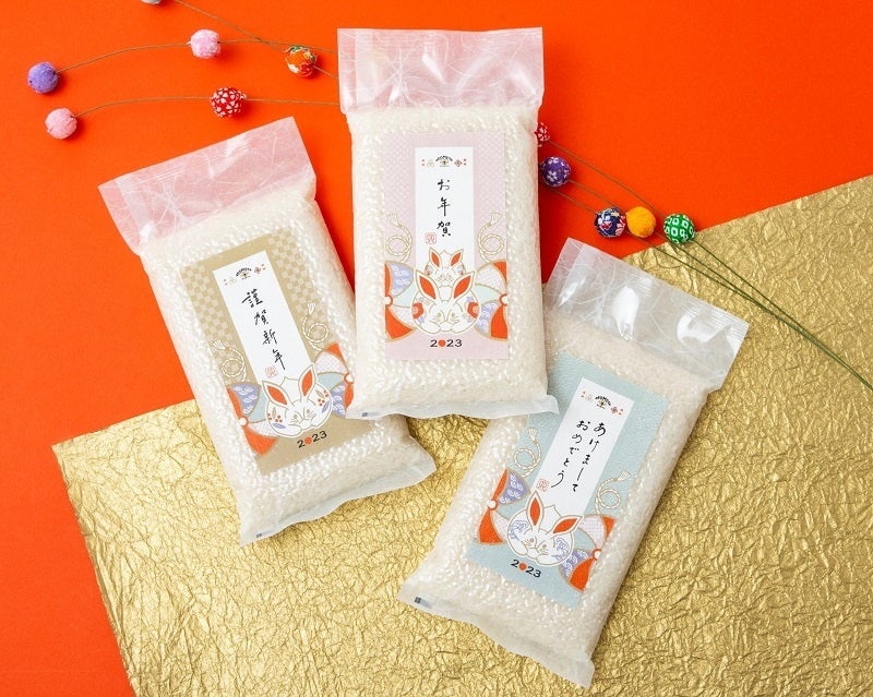 「卯」の文字が入った干支米や、「お年賀」「謹賀新年」「あけましておめでとう」のメッセージ米、鏡開きの豆樽、お年賀限定デザインのお菓子やかや生地ふきんなどをご用意。お年賀のご挨拶に最適です。