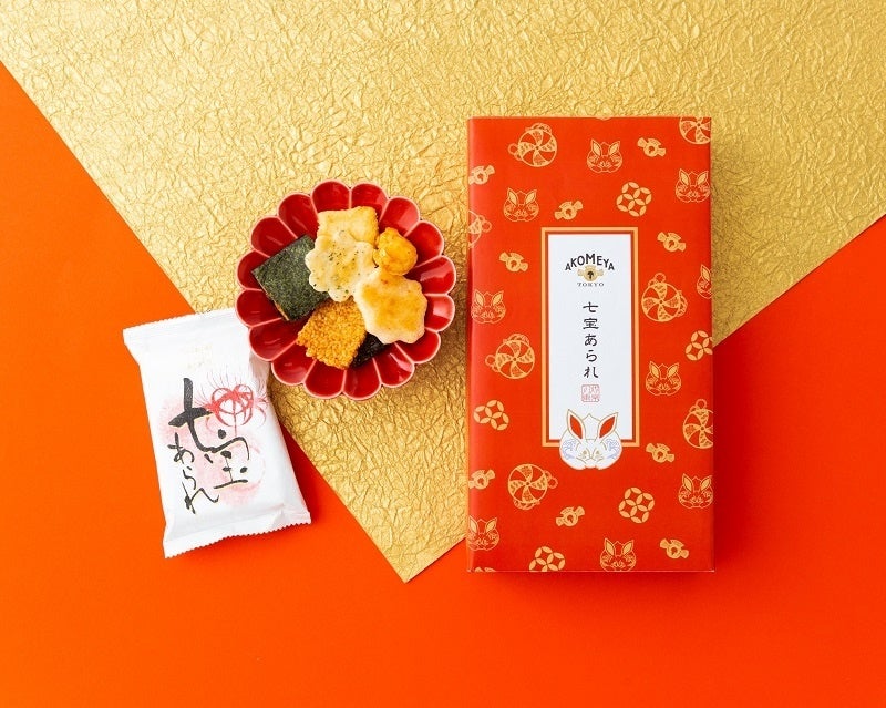 国産米100%使用。有明海苔の海苔巻き、焼きおにぎり風味の米粒焼き、黒胡麻60%の角黒胡麻、肉厚サクサクのえび桜、サラダ味の小菊、ほんのり甘い醤油おかき小落花、米菓の王道ざらめの7種類。