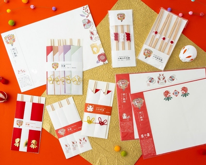 祝い箸の長さは末広がりの八寸(約24cm)。両方の先端が細くなっており、一方は神様、もう一方は人が使う「神人共食」を意味します。祝い敷紙は、平安時代から続き徳川幕府の御用紙として献上されていた歴史をもつ和紙の産地・山梨県市川三郷町の「めでたや」の和紙に、干支のうさぎや向い鯛をあしらいました。