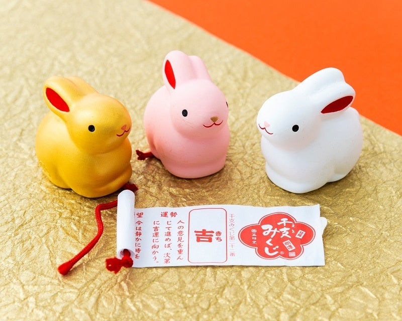 おみくじになっている卯は金・ピンク・白の三種類。新年の運試しやご挨拶に。底面の赤い紐を引くと中からおみくじが出てきます。小吉・吉・中吉・大吉のうちどれかが入っています。
