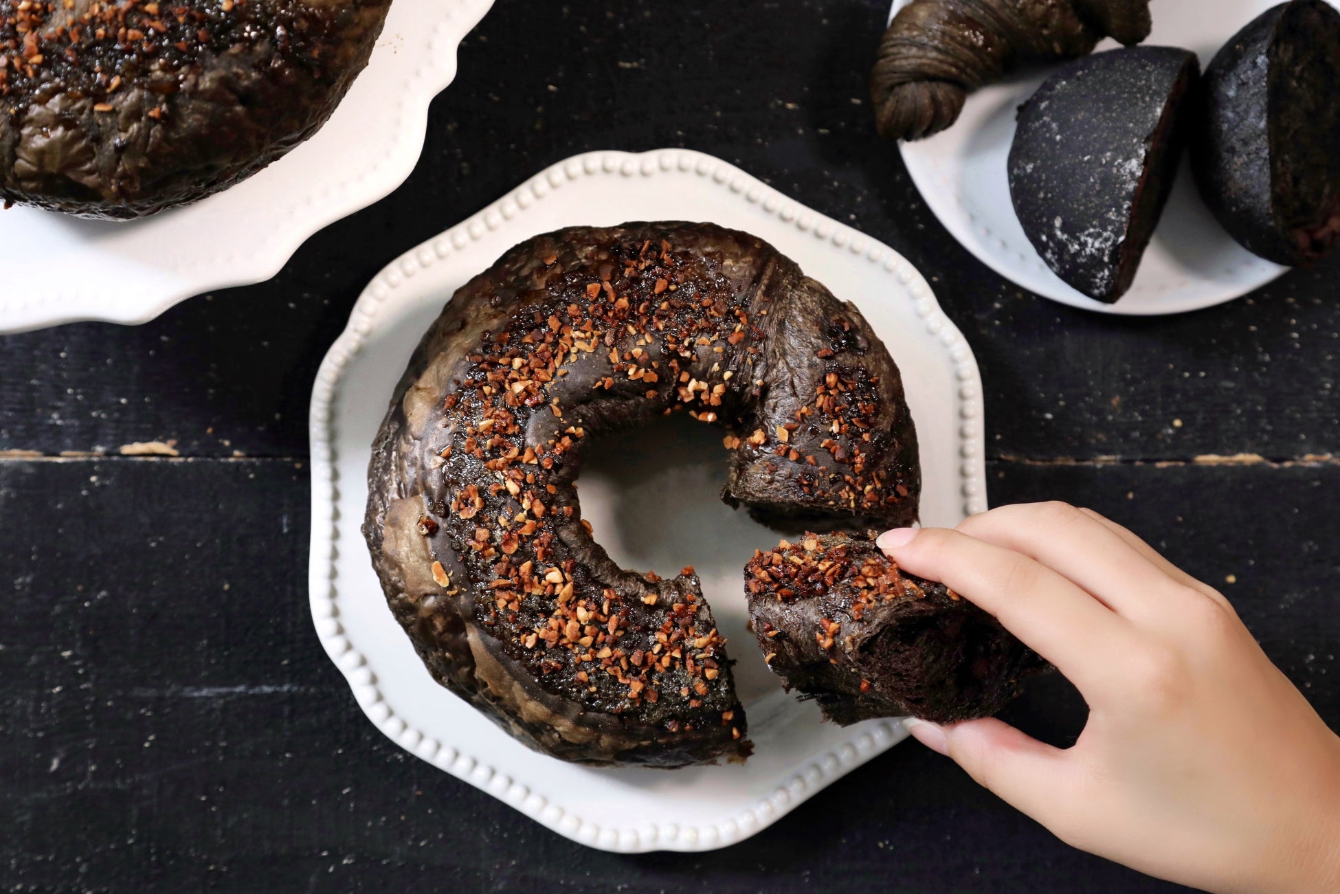 - ブラックココアを練り込んだデニッシュ生地にチョコチップを巻き込み、リング状に仕上げました。