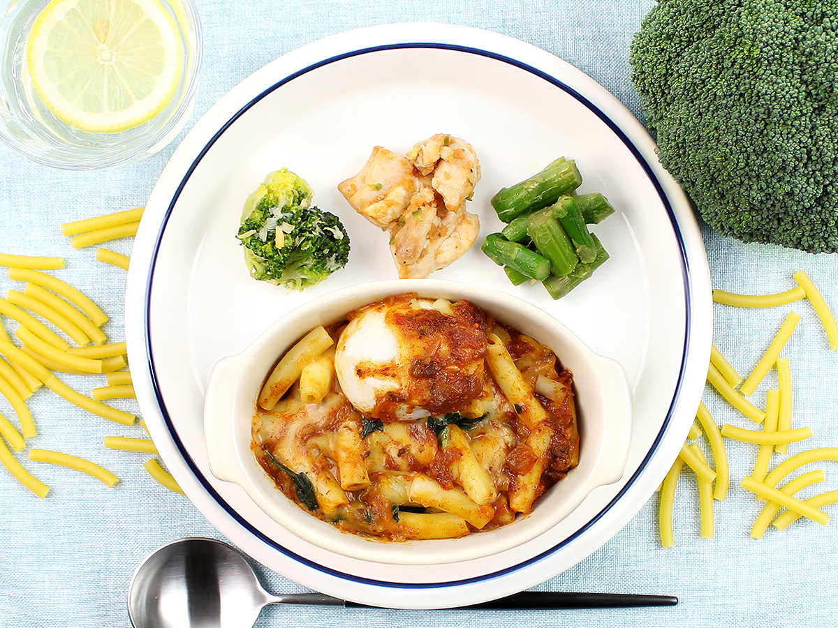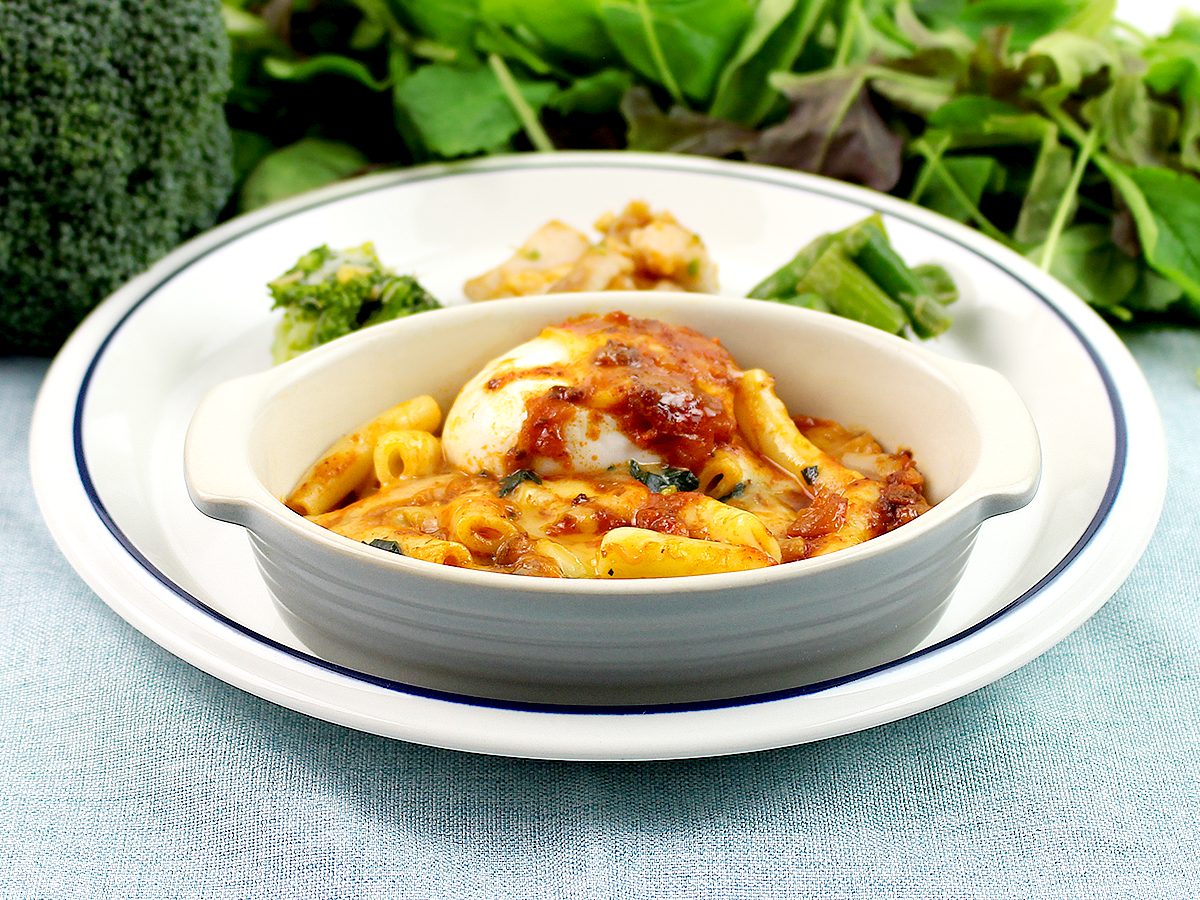 マカロニとほうれん草、とろけるチーズに濃厚なミートソースを使用した、マカロニグラタンです。トッピングの卵(加工卵)は温めても半熟風ですので、絡めていただくと味の変化が楽しめるプレートです。