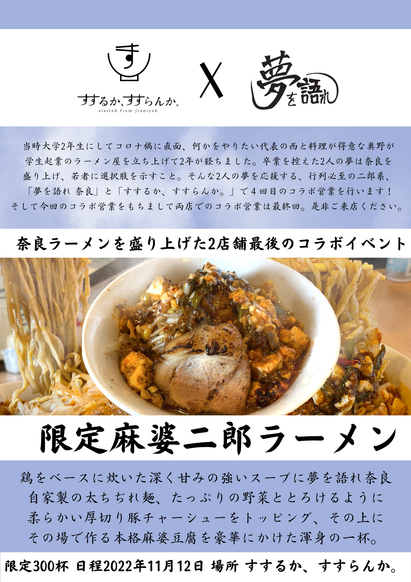コロナ禍に起業した現役大学生が営むラーメン屋“すするか、すすらんか。”と全国展開する二郎系ラーメン屋グループの“夢を語れ 奈良”が、2022年11月12日に一日限定のコラボ営業を開催します。