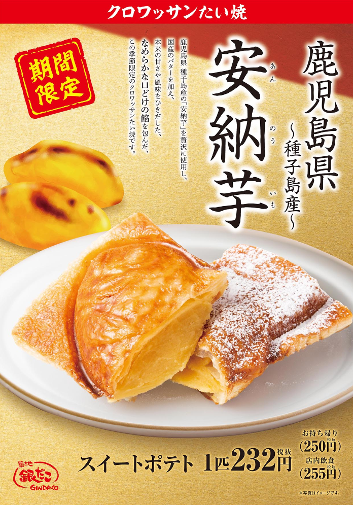 築地銀だこhttps://www.gindaco.com/を展開する株式会社ホットランドhttp://www.hotland.co.jp/(本社:東京都中央区、代表取締役社長:佐瀬守男)は、2022年11月18日(金)より全国の築地銀だこ店舗(一部店舗を除く)にて、クロワッサンたい焼 『安納芋 スイートポテト』・薄皮たい焼『鳴門金時 芋あん』を期間限定で発売いたします。