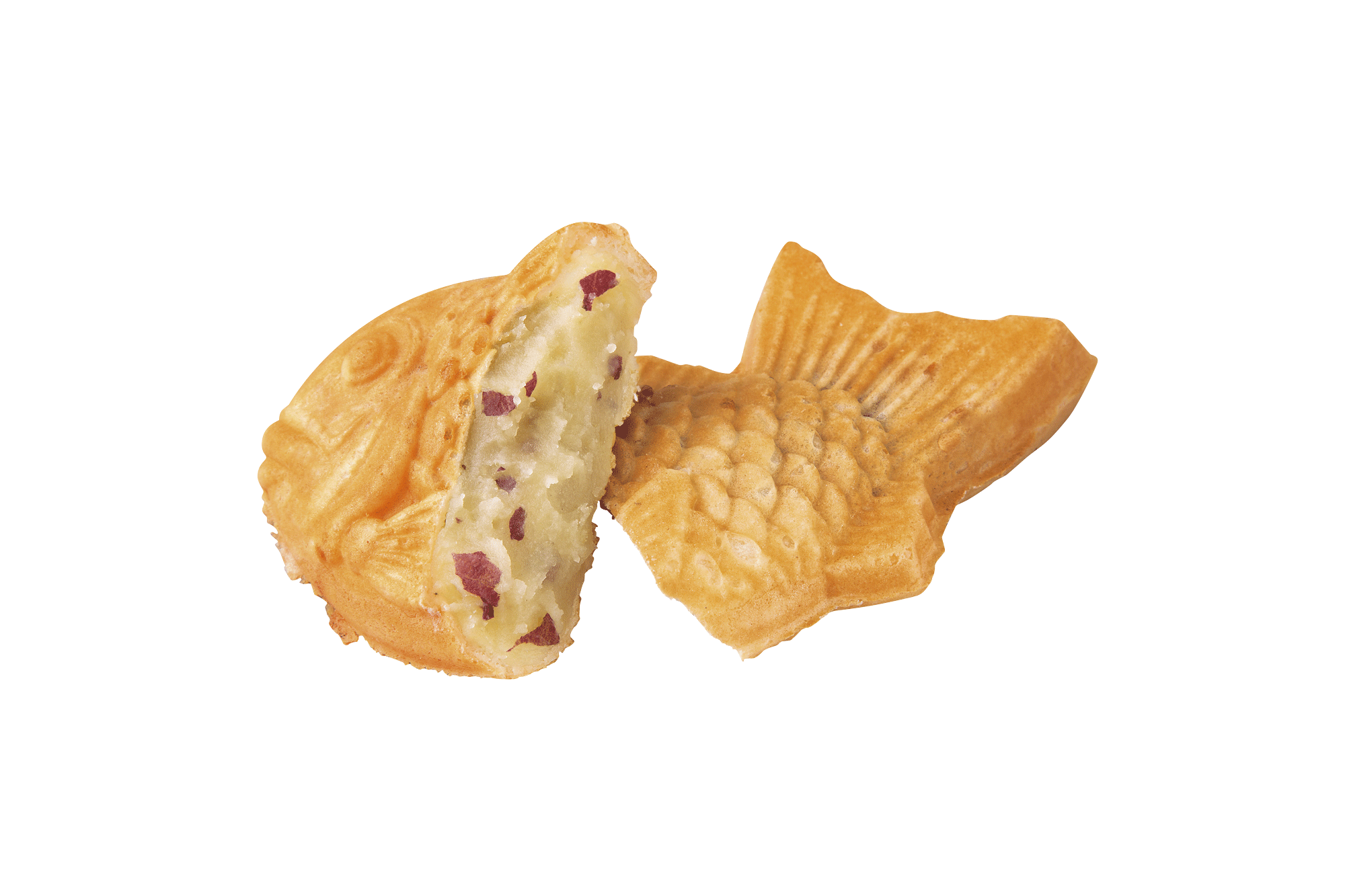 薄皮たい焼『鳴門金時 芋あん』(下)は、徳島県産の「鳴門金時」を使用し、加熱すると柔らかい甘みとホクホクした食感が特徴で、さつま芋の素材感を大切に、特製の芋あんを薄皮にたっぷり包み込みました。