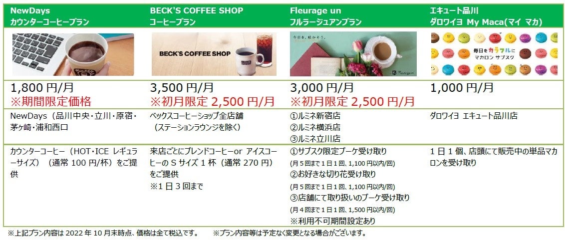 月額1,800円(税込)で対象店舗のNewDaysで来店ごとにカウンターコーヒー(HOT・ICEレギュラーサイズ)が1杯受け取れるプラン。従来の5店舗(品川中央店、原宿店、茅ケ崎店、浦和西口店、立川店)に加え、新たに池袋駅構内3店舗(池袋店、池袋北口店、池袋西口店)で取扱いを開始します。
