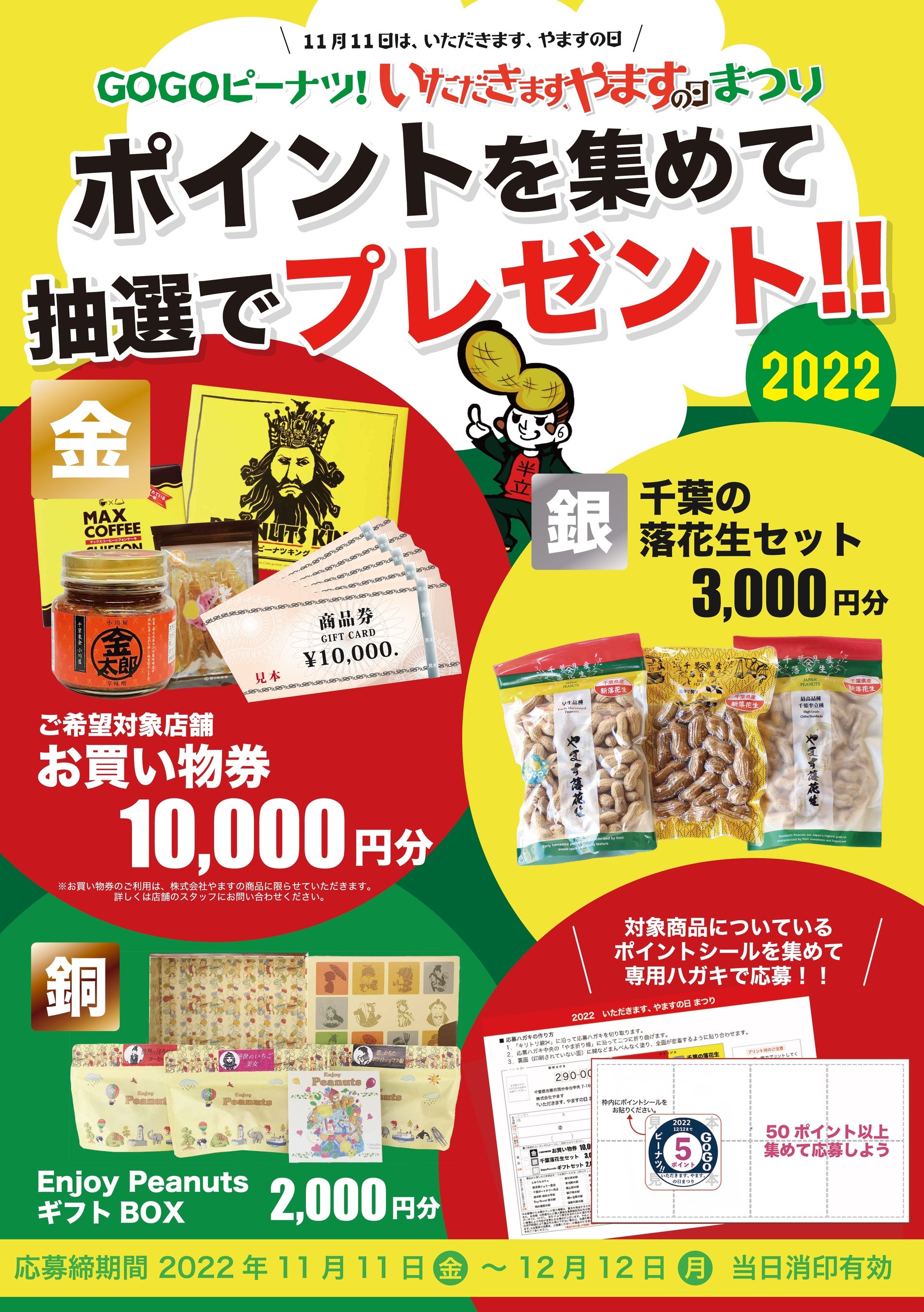 千葉県の「食」のお土産を中心に、3000品を超える商品の製造・流通・店舗運営を手掛ける株式会社やます(千葉県市原市 代表取締役 諏訪 聖二)は、先日告知した2022年“いただきますやますの日”まつりの各種イベント、キャンペーン情報(11月11日~12月11日まで)を自社イベントHPにて公開開始いたしました。メインとなる“落花生運動会”は柏の葉房の駅(11/20(日))、草刈房の駅(11/23(水祝))で開催いたします。一般参加大歓迎ですので告知HP内のイベント情報をご確認のうえお気軽にご参加ください。 “やます”はこれからも千葉県に軸足を置き、「千葉のおいしいを大切にする」、「何気ない日常を特別に」をスローガンに美味しい千葉の食をお届けして参ります。