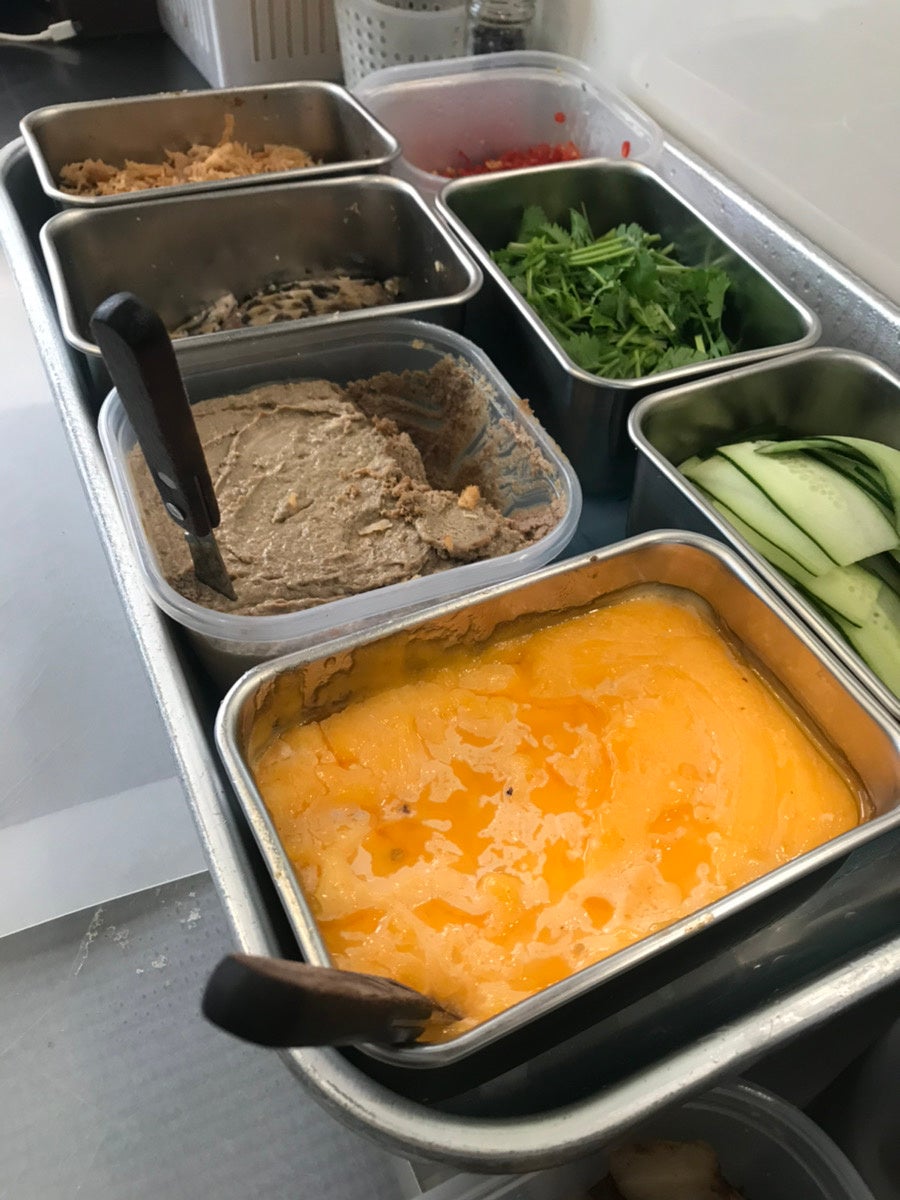 バインミーバーバーでは、バインミーを本場の味に再現するために、パンや具材にこだわって作っています。 調味料はベトナムで実際使われているものを使い、具材は⽇本にないものが多いため、ほとんどを⼿作りしています。ベースとしてパンに塗るマヨソースとレバーペーストは秘伝の味。マヨソースは、⽇本のマヨネーズを違って卵の味が濃厚で、酸味が少なくとろみが強い。⽢味のないカスタードクリームのようです。レバーペーストは、豚と鶏のレバーを使⽤。しっかりとした処理をしたレバーは臭みが少なく、スパイスが効いた濃厚な味わいとクリーミーな⾆触りが最⾼です。