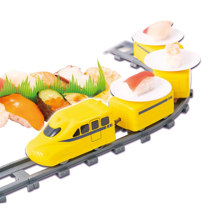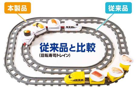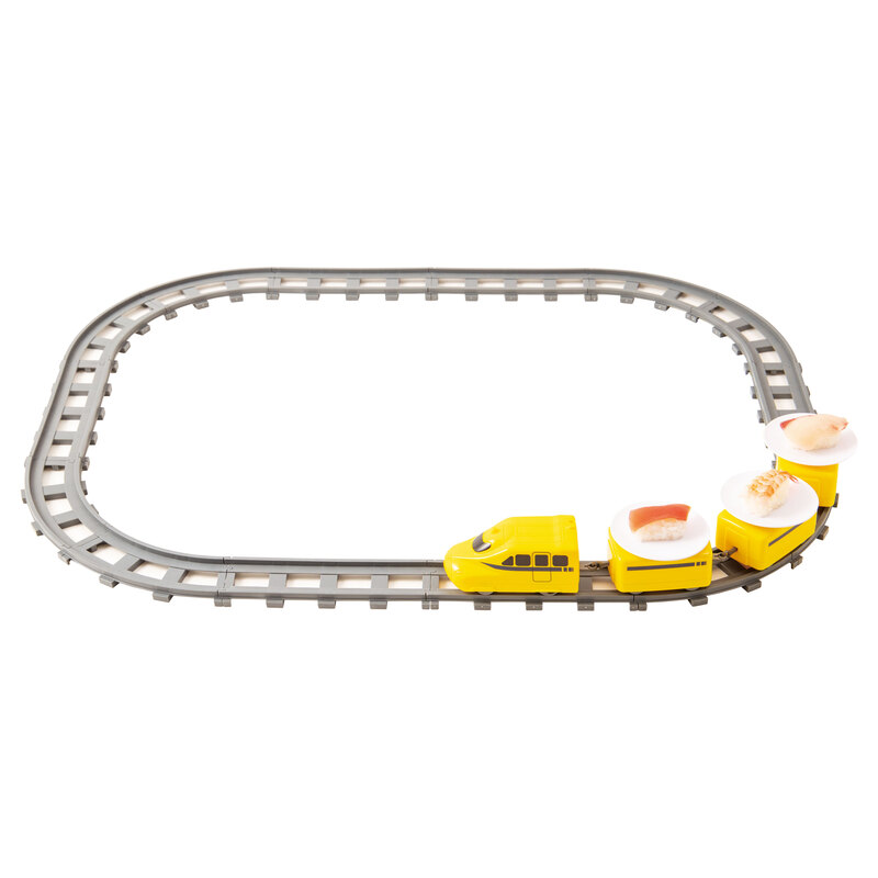 『回転寿司トレイン』は、2015年に発売以降、これまでに13万台以上を販売したライソン株式会社のヒットシリーズです。従来品は白いトレインが全長159㎝のレールを走りますが、お客様のご要望にお応えし、新製品の車体はイエロー、レールも234㎝に長くなりました。