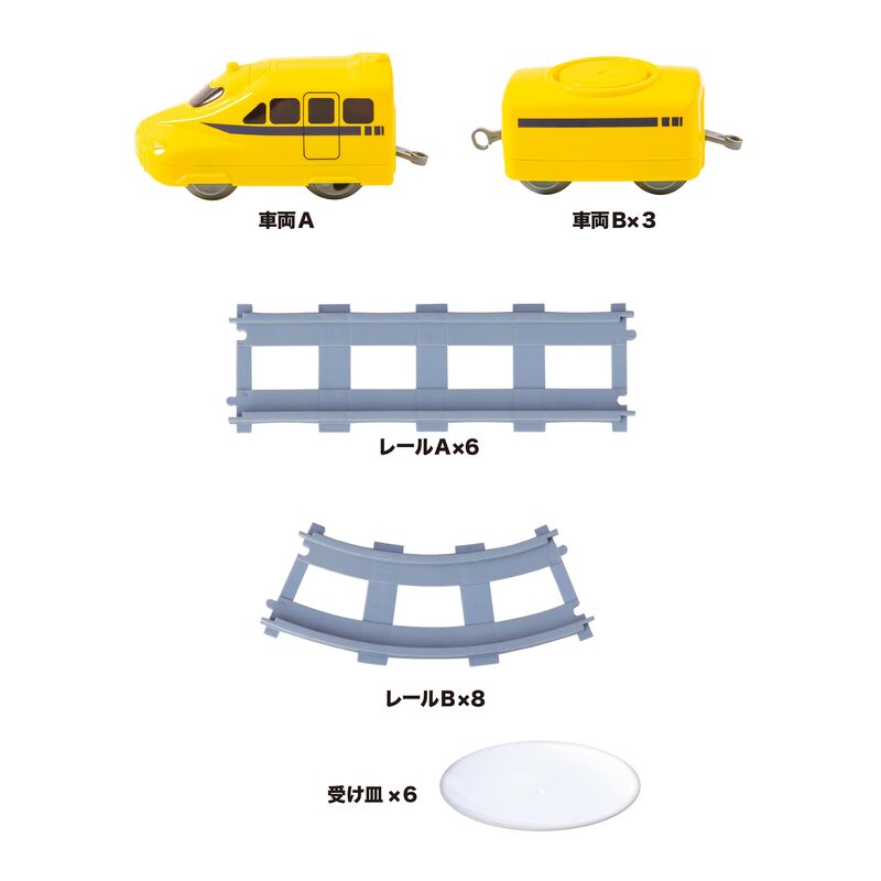 セット内容:車両A×1、車両B×3、レールA×6、レールB×8、受け皿×6