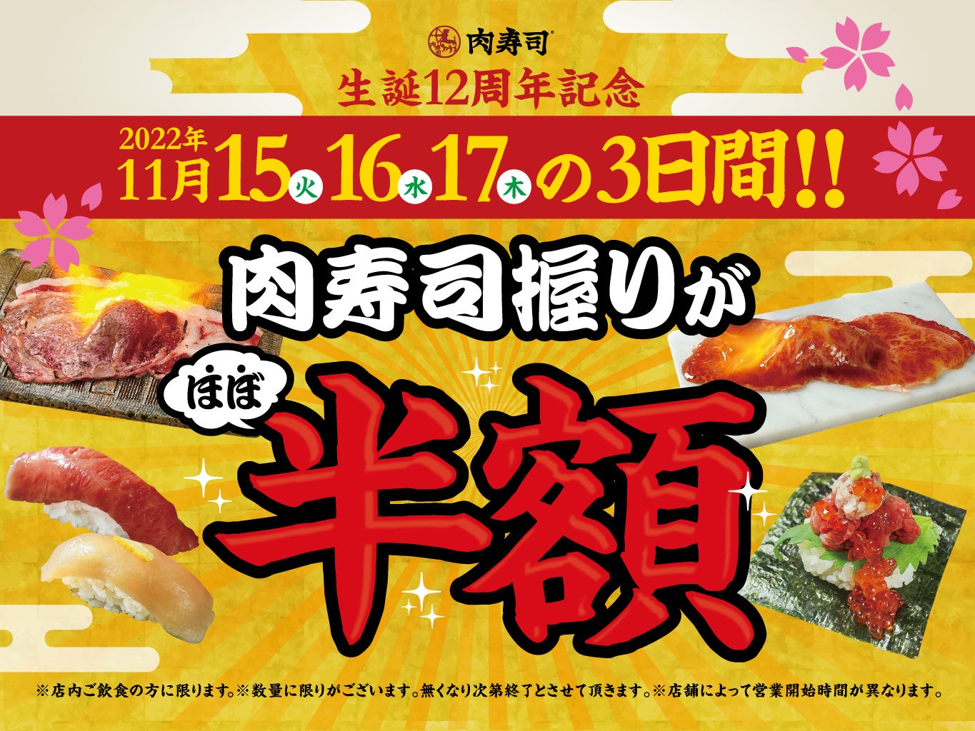 株式会社ガーデン(本社:東京都新宿区 代表取締役社長:川島賢 以下「当社」)が運営する「肉寿司」は、多くのお客様よりご愛顧いただき、2022年で創業12周年を迎えました。これを記念して、全国の肉寿司※で2022年11月15日(火)から11月17日(木)の3日間限定で、名物さしとろを含む計19種のメニューを半額でご提供いたします。