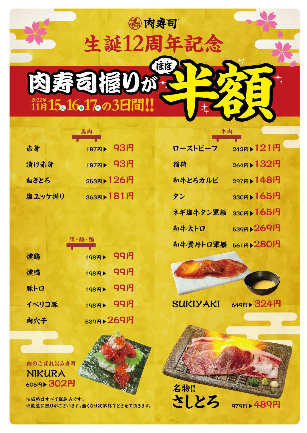 そして、多くのお客様にご愛顧いただき、今年で創業12周年を迎えることができました。今回、これを記念して、これまで支えてくださったお客様への感謝を込めて、大人気メニューの「さしとろ」を含む、19種類のメニューを、2022年11月15日(火)から11月17日(木)の3日間限定で、半額という特別価格でご提供いたします。ぜひお近くの肉寿司へご来店ください。皆様のご来店を従業員一同、心よりお待ちしております。