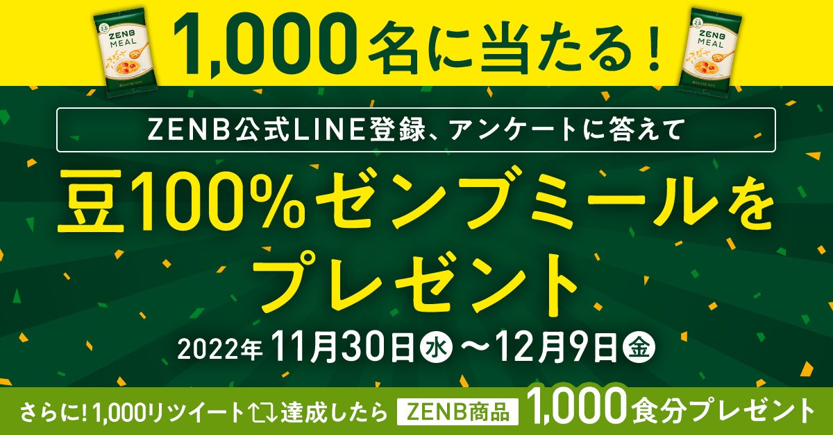 ZENB公式Twitterからのキャンペーンに関するお知らせ投稿が1,000リツイートを達成すると、ZENB商品1,000食分(20名に各50食)を応募者の中からさらに抽選でプレゼント
