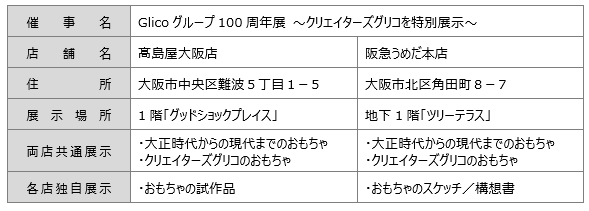 大阪で発売を開始した栄養菓子「グリコ」は、今年で発売から100周年を迎えました。「キャラメル」と「おもちゃ」が一つになった同商品のおもちゃの数は約3万種類55億個にのぼります。この度、それらのおもちゃの一部と、特別商品「クリエイターズグリコ」のおもちゃを展示する「Glicoグループ100周年展 ~クリエイターズグリコを特別展示~」と題した催事を「髙島屋大阪店」と「阪急うめだ本店」の両店にて共同実施します。