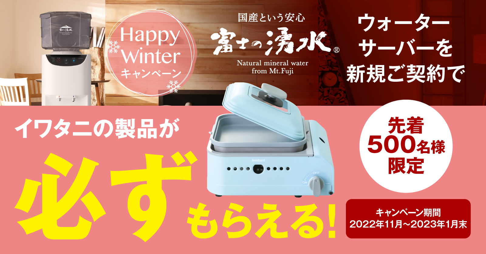 富士の湧水 「Happy Winter キャンペーン」Webページにて、富士の湧水ウォーターサーバーを新規で設置いただいた方、先着500名様に、「カセットガス ホットプレート『ミニマル』」をはじめ、以下の豪華特典をプレゼントいたします。