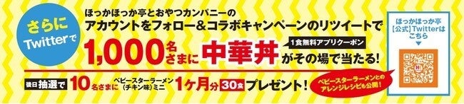 (@BABYSTAR_OYATSU)両方をフォローいただき、ほっかほっか亭公式アカウントにて毎日投稿されるキャンペーンツイートをリツイートしていただいた方の中から抽選で1000名様にほっかほっか亭の「中華丼」をその場でプレゼント※3、また、キャンペーン終了後、「ベビースターラーメン(チキン味)ミニ1か月分(30食)」を抽選で10名の方にプレゼントいたします※4。キャンペーンツイートは毎日投稿いたしますので、期間中毎日キャンペーンにご参加いただけます。