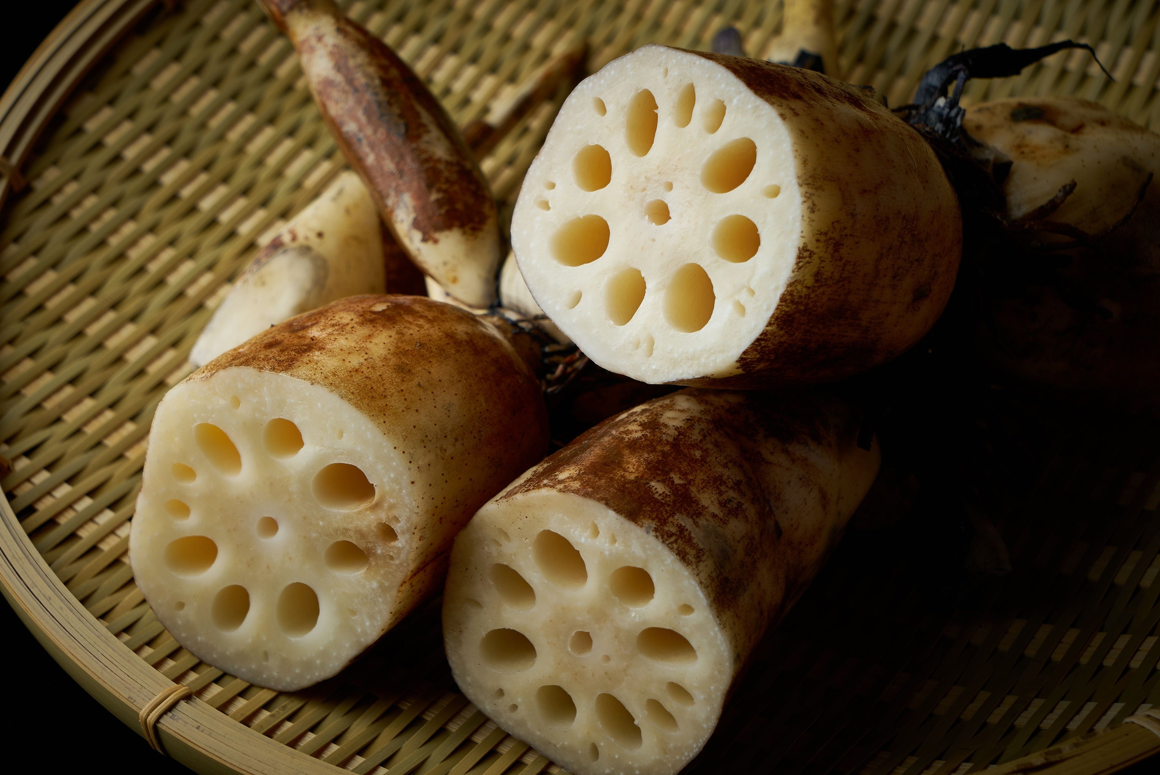 他県のものに比べると、節間が詰まった太くて締まった見た目。また、れんこんの穴が小さく、持って見るとみためよりもずっしりとした重量感があります。節によって料理法も変えていただくともっと美味しくいただけます。