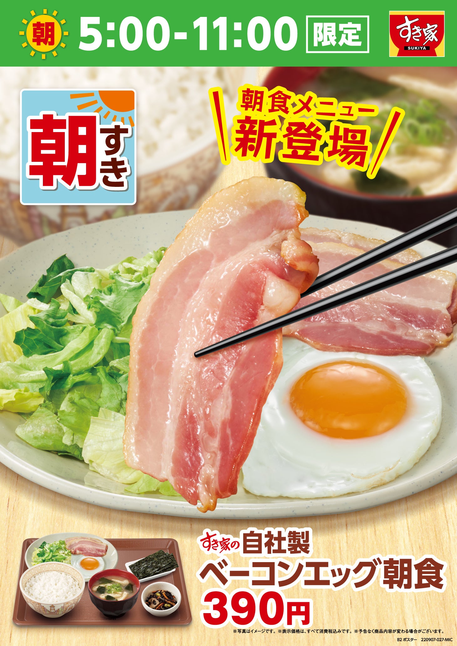 ぜひこの機会に、お近くのすき家で、新朝食「自社製ベーコンエッグ朝食」をお楽しみください。