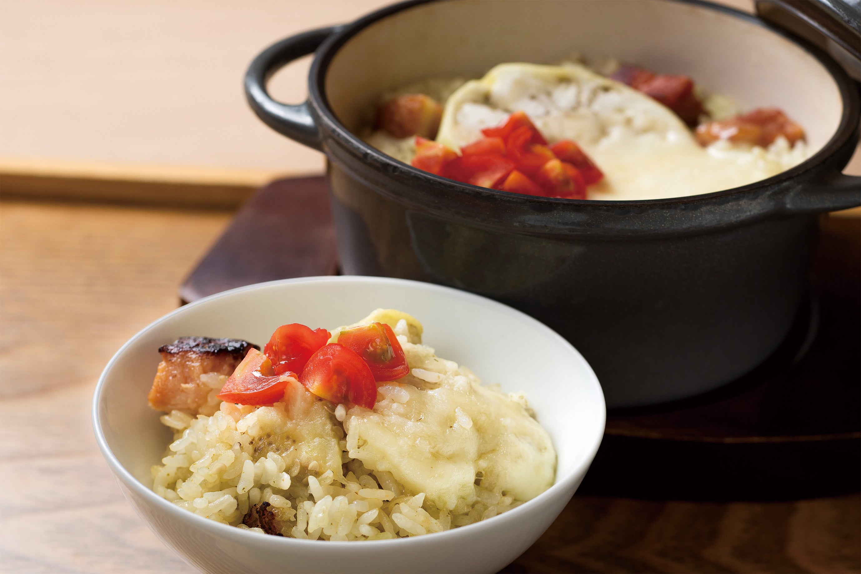 静岡市産折戸なすとモッツァレラチーズ、ベーコンを洋風だしで炊きあげました。フレッシュな藤枝市産ブランドトマト「ほれ丸」をのせた風味豊かなバジル薫る炊き込みご飯です。