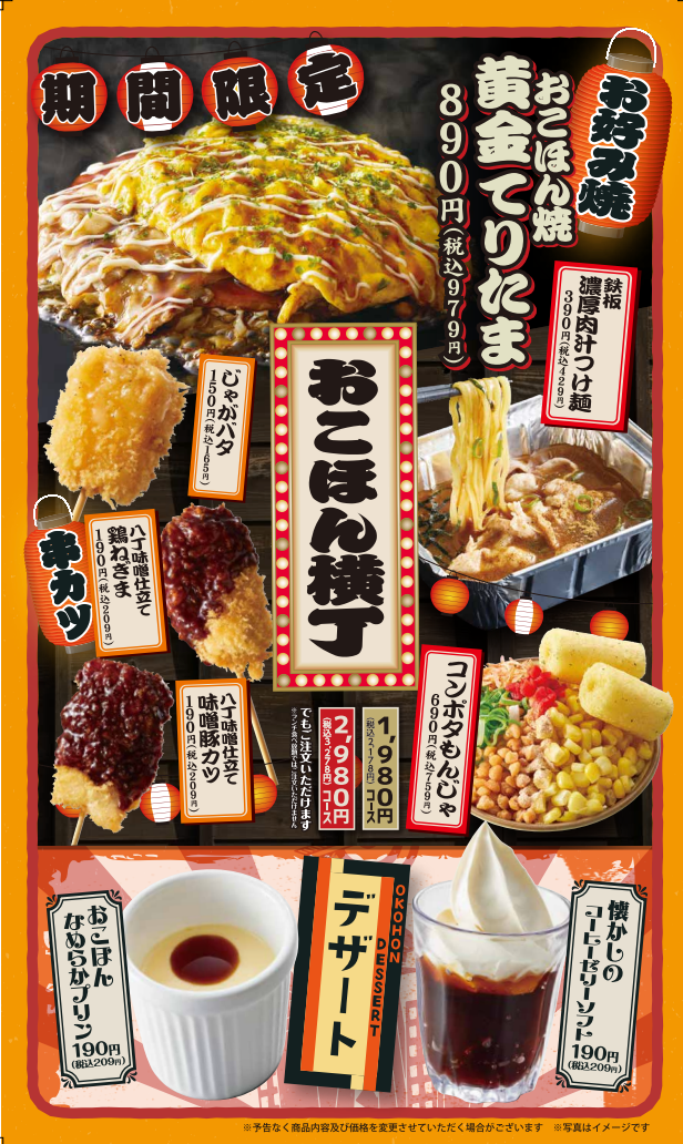 ※期間限定商品は、食べ放題コースの「スタンダードコース 1,980円(税込2,178円)」「おこほんプレミアムコース 2,980円(税込3,278円)」でもご注文いただけるほか、単品でもご注文いただけます