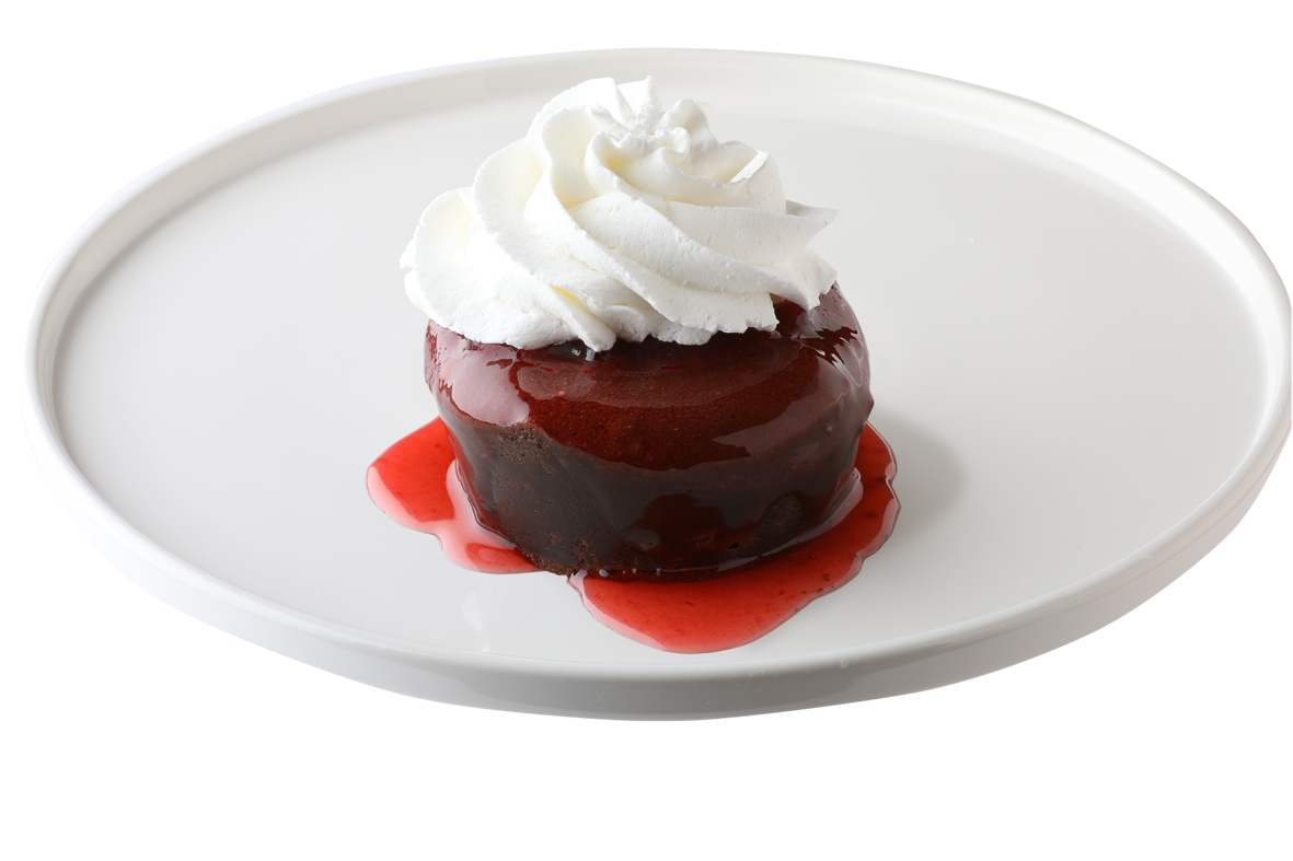 フォンダンショコラの上から甘酸っぱいベリーソースをたっぷりとかけ、その上にホイップクリームをトッピングしました。ビターなフォンダンショコラとホイップクリームの相性は抜群で、甘酸っぱいベリーソースがアクセントとなっています。ほんのり温かいフォンダンショコラの中からガナッシュがとろけ、口当たりの違いも楽しんでいただけます。コーヒーや紅茶とも相性が良く、ほっと一息つきたい寒い日のカフェタイムにおすすめの一品です。