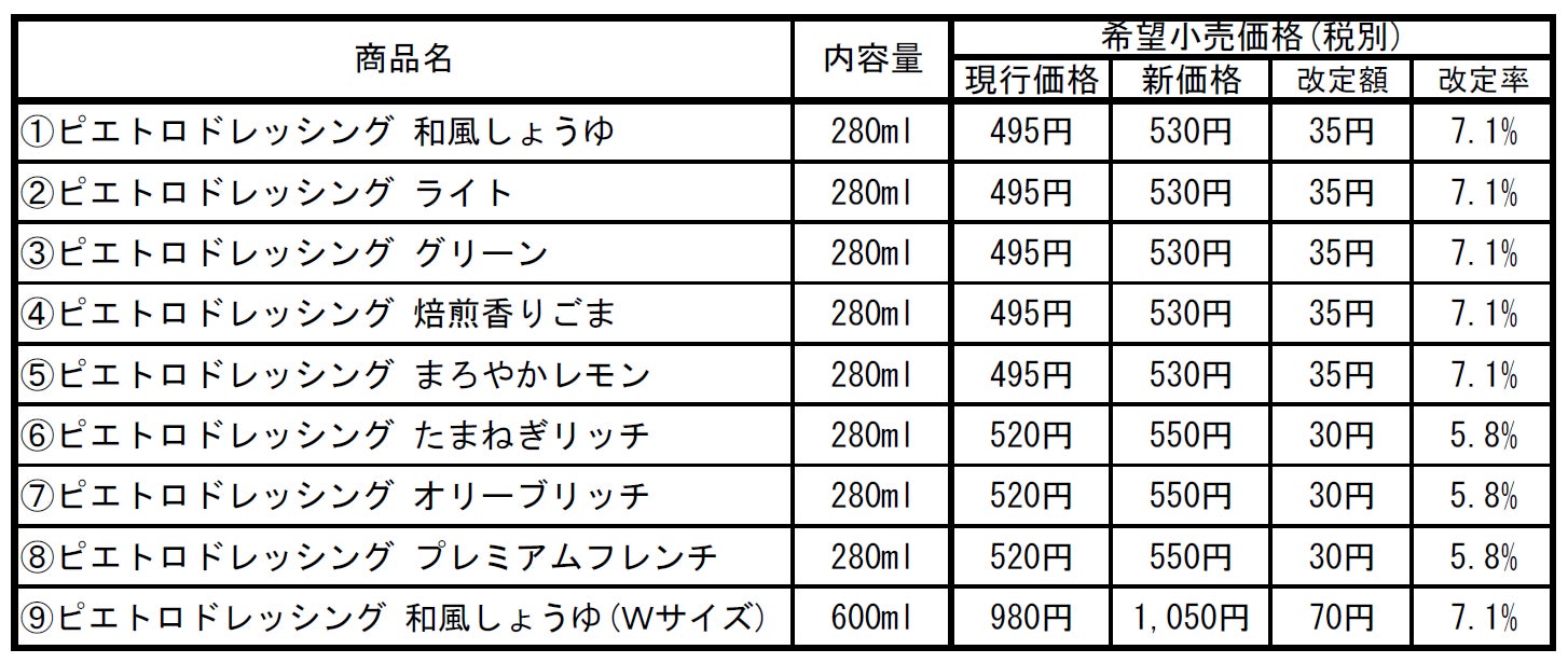 株式会社ピエトロ(本社:福岡市中央区、代表取締役社長:高橋泰行)は、ピエトロドレッシング9点の製品価格を、2023年1月1日(日)以降出荷分から改定いたします。