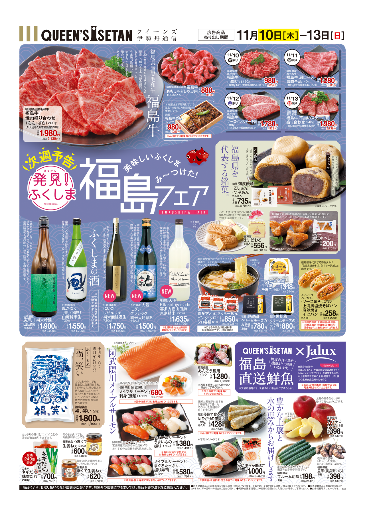 クイーンズ伊勢丹は毎度ご好評いただいている東京電力ホールディングス(株)のご協力のもと「福島フェア」を11月10日(木)~11月13日(日)期間限定で開催いたします。