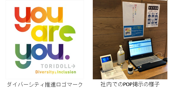 トリドールグループのダイバーシティ推進のロゴマークをステッカーにし、順次配布を行っています。コミュニティ主催で、2022年10月11日のカミングアウトデーに合わせて渋谷本社オフィスにて「ステッカー配布イベント」を実施しました。コミュニティメンバーが、従業員に声がけし、ステッカーを配布しながらコミュニティ活動をはじめダイバーシティ推進への取り組みに対する認知拡大に努めました。