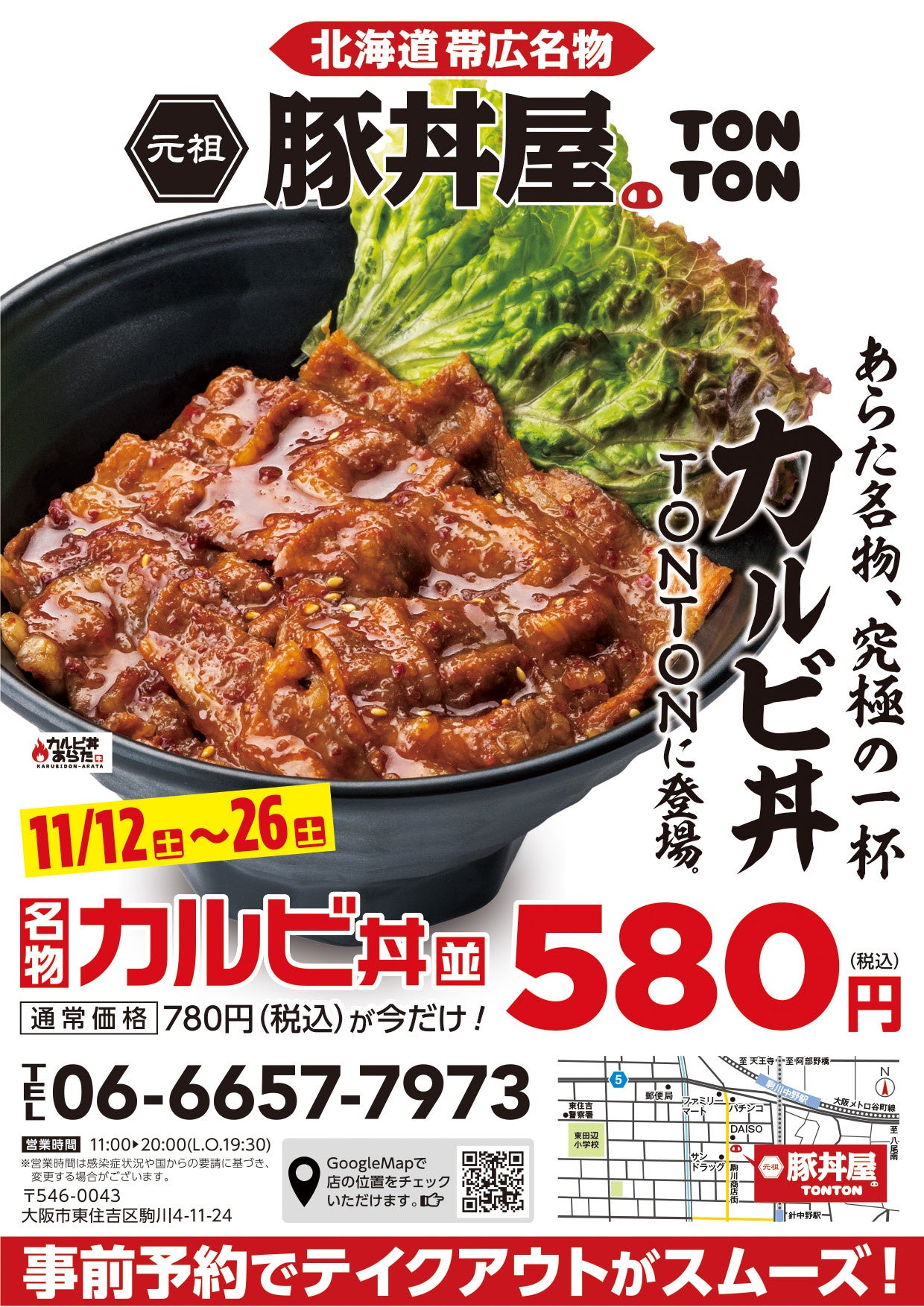 北海道・帯広豚丼が人気の「元祖豚丼屋TONTON 駒川店」(住所:大阪府大阪市東住吉区駒川4-11-24、TEL:06-6657-7973)に新メニューが登場!11月12日(土)〜26日(土)に限り「カルビ丼【並】」を期間限定価格580円(税込)で提供いたします。