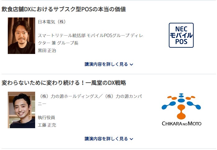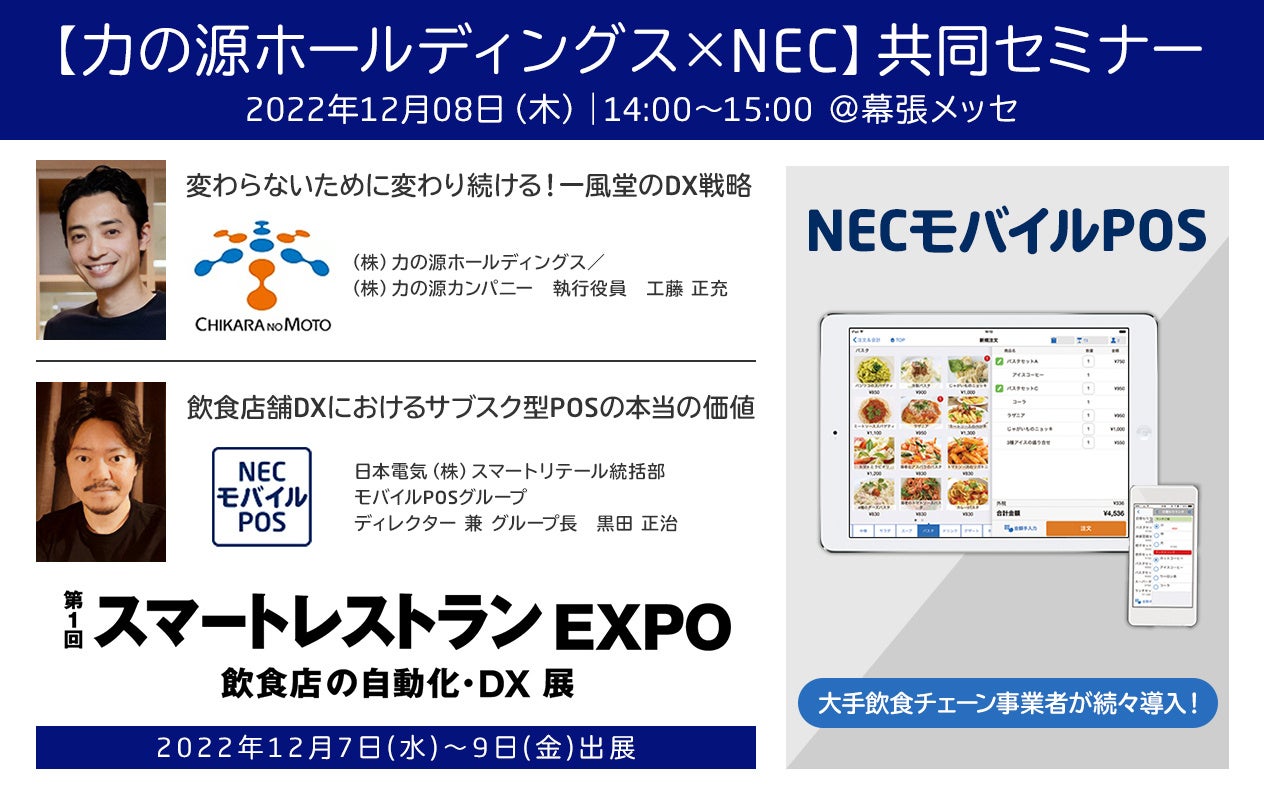 力の源ホールディングス 執行役員の工藤氏と、NECモバイルPOS グループ長の黒田による「特別講演」が12月8日(木)14:00~15:00に開催されます。『最新POSシステムが担う飲食DXの未来』についてディスカッションを交えながら紹介します。