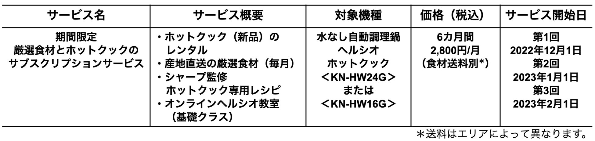 シャープ株式会社(本社:大阪府堺市、代表取締役社長 兼 CEO:呉柏勲、以下:シャープ)と家電のサブスク・レンタルサービス「レンティオ」を提供するレンティオ株式会社(本社:東京都品川区、代表取締役社長:三輪謙二朗、以下レンティオ)、国内最大級の産直アプリ「ポケットマルシェ」を運営する株式会社雨風太陽(本社:岩手県花巻市、代表取締役:高橋博之、以下:雨風太陽)の3社は、シャープの水なし自動調理鍋「ヘルシオ ホットクック」のレンタルに加え、ホットクックで調理できる厳選された食材やレシピ、料理教室を連携させ、継続的に健康調理をお楽しみいただける新たなサブスクリプションサービスの実証実験を、本年12月1日に開始します。