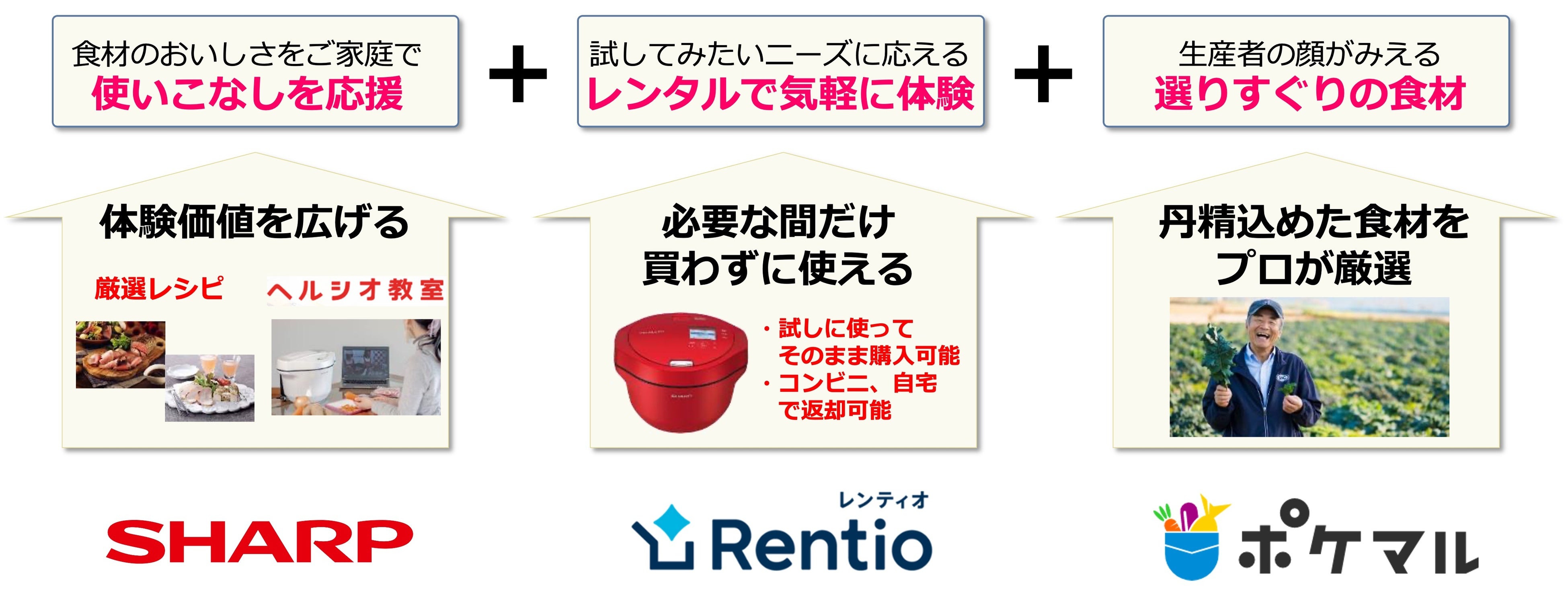 シャープ株式会社(本社:大阪府堺市、代表取締役社長 兼 CEO:呉柏勲、以下:シャープ)と家電のサブスク・レンタルサービス「レンティオ」を提供するレンティオ株式会社(本社:東京都品川区、代表取締役社長:三輪謙二朗、以下レンティオ)、国内最大級の産直アプリ「ポケットマルシェ」を運営する株式会社雨風太陽(本社:岩手県花巻市、代表取締役:高橋博之、以下:雨風太陽)の3社は、シャープの水なし自動調理鍋「ヘルシオ ホットクック」のレンタルに加え、ホットクックで調理できる厳選された食材やレシピ、料理教室を連携させ、継続的に健康調理をお楽しみいただける新たなサブスクリプションサービスの実証実験を、本年12月1日に開始します。