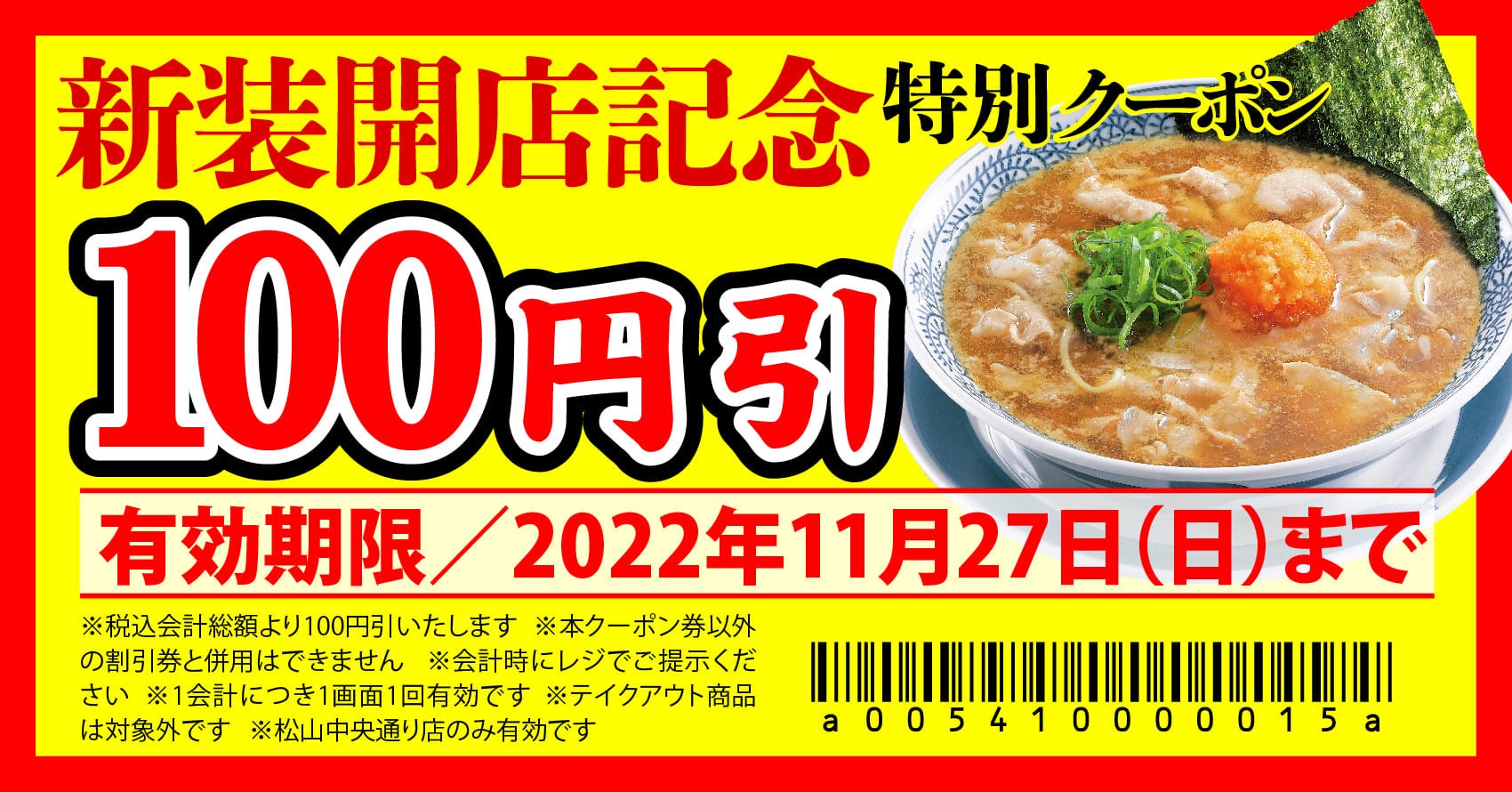リニューアル記念として、2022年11月27日(日)まで『丸源ラーメン 松山中央通り店』のみでご利⽤いただける100円引クーポンを配布します。