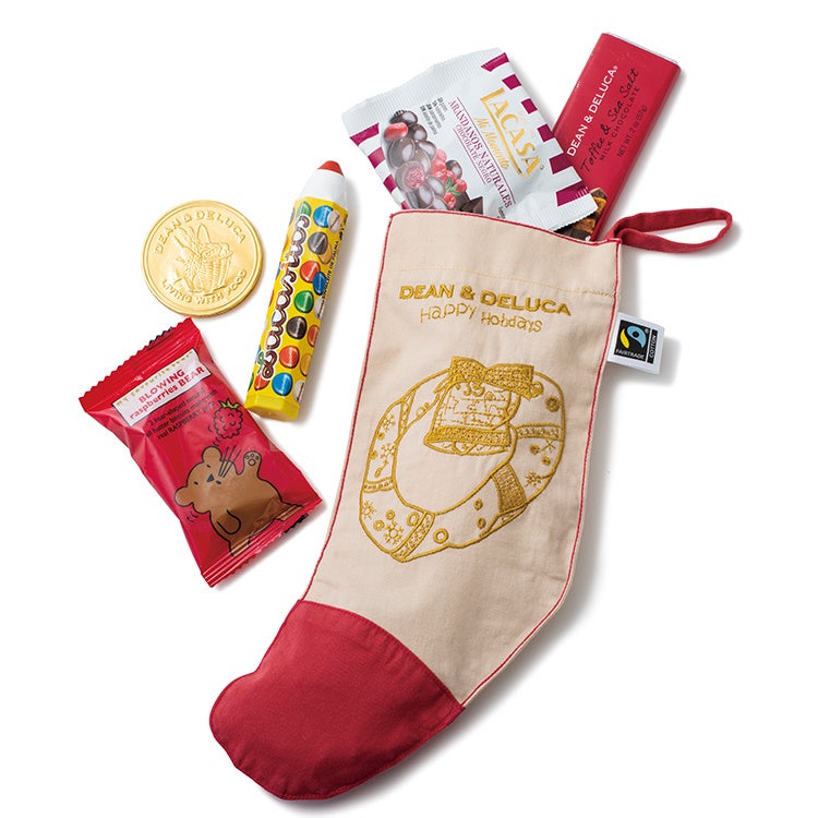 クリスマスモチーフの刺繍を施したソックスにお菓子を詰め込んだ、遊び心のあるギフト。お部屋に飾って。